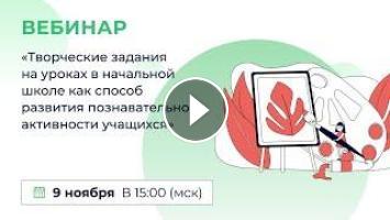 09 ноября в 15:00 (МСК) приглашаем учителей начальной школы, педагогов дополнительного образования и методистов на вебинар «Творческие задания на уроках в начальной школе как способ развития познавательной активности учащихся».