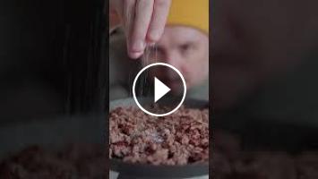 1. Обжариваем говяжий фарш до зажаристой корочки с двух сторон. Для этого хорошо нагреваем сковородку, выкладываем фарш, слегка приминаем, и жарим, не мешая, около 5-7 минут. Далее переворачиваем и снова жарим, не мешая. После этого готовый фарш солим, перчим, разбиваем на мелкие кусочки, накрываем сыром и готовим еще 5 минут (пока сыр не расплавится)