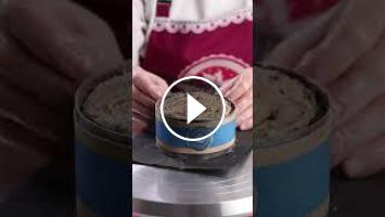 Из ацетатной ленты вырезать полосу высотой 5,5 см. Равномерно нанести темперированный шоколад или шоколадную глазурь. Обернуть торт, пока шоколад ещё пластичный. Оставить на 10 минут, снять пленку.