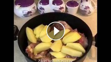 Закрываем плотно крышкой и ставим на маленький огонь.Забываем про блюдо на полтора часа.Через полтора часа проверяем картошку на готовность.Если она готова блюдо можно подавать к столу.Если хотите получить блюдо с зажарит ой курицей без сока?Готовьте на среднем огне.