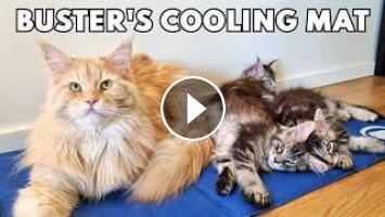 It's a very hot day and Maine Coon cat Buster is given a coooling mat. It's so nice for him to sit on it, but the cooling mat sure looks tempting for the other cats in the house as well!