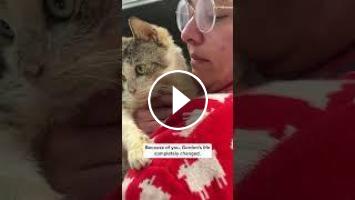 This cat was outside, searching for food. He was emaciated and covered in dirt. We named him Gordon, and gave him a much needed bath. He was so happy to be inside, nuzzling up to every volunteer who came near. Because of you, his life completely changed. He got all the care he needed, and the chance to recover and rest. Now he’s in his forever home surrounded by all the love and comfort he deserves.