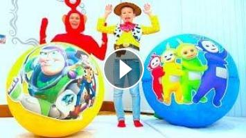 Max pretend as a Woody and papa in mascot costume Tinky Winky play with toys in Giant surprise balls. Max ride on toy car with googly eyes and daddy play with toy kitchen. Son and dady have a good play time with kids toys