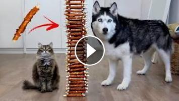 I built a giant tower of 124 meaty dog treats. Each of my huskies took turns walking into the room and confronting this mountain of goodies. And each of the cute dogs reacted in their own unique way. Husky Yuki just went crazy when she saw this mountain of food. Husky Olive showed her logical thinking. And cute husky Monty was a little embarrassed. And of course the two cats also tried to solve the problem with the mountain of treats.