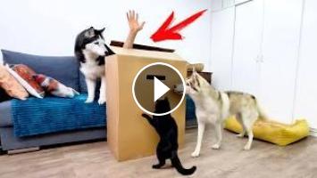 I finally have my own personal space! I hid from my pets in a box. And of course I brought some treats with me. The cats found me pretty quickly. Bat the cat thought I'd taken over his new home. My dogs made a real rescue mission to get me out of the box. Especially the husky Yuki used all her canine fighting spirit to get to me, or rather to the treat I was hiding. It turned out to be quite a fun prank.